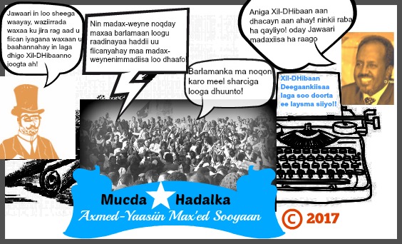 Laga soo bilaabo burburkii qarnkeenii ku dhacay waxaa shacabka wakiil ka noqday Xildhibaano aysan shacabku keensan oo lagu keenay qaab farsamaysan oo magac beeleed ku salaysan, waxaana dhibaatada ugu sii daray oo taladu farihii ka sii baxday markii sidii la qorsheeyay ay beelihii is garab yaaceen oo beel kasta is tiri yaan kuraasta lagaa badsan, taasina waxay horseedday in la ilaaway ujeeddadii iyo dantii Xildhibaanka laga lahaa…oo maxay tahay?!….caqligii iyo garashadiina waxay ku soo koobmeen in niman geeloodii la jooga laga soo wado oo xil-dhibaan laga dhigo!.. in niman beerahoodii falanaya inta laga soo wado xildhibaan laga dhigo, nima aan waligood arag canshur la bixinayo, niman aan waligood arag dowlad hoose, degmo iyo gobol iyo sida ay u shaqeeyaan oo aan la fahamsiin karin deegaan inuu ka yimid oo uu wakiil u yahay!…..waaba halkaas meesha waxa oo dhan ay ka khaldameen oo siyaasadda dalka laga naafeeyay… ninkaas dariiqa isagoo taagan laga soo waday isna wuxuu inoo doortay oo dalkii madax-weyne uga dhigay nin kale oo dariiq taaganaa oo aan la aqoon sababta loo doortay, taasi waxay inoo dhashay in la waayo qof mas’uul ah oo dareemay xuquuqda dadku iyo dalka leeyihiin….wuxuu xeer inooga dhigay wax aan ummad xeer u noqon karin!….Ninkii madax-weyne soo maraaba markuu xilka ka dago wuxuu noqonayaa Xildhibaan aan dhicin ilaa uu dhinto!