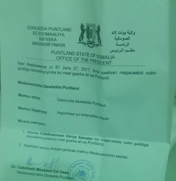 Dikreeto ku taariikheysan 27 bishii June 2017 ayuu Madaxweynaha Puntland Cabdiweli Maxamed Cali (Gaas) ugu magacaabay xubin ka mid noqonaysa guddiga doorashooyinka kumeelgaarka ee hanaanka asxaabta badan Puntland Caaqil Cabdiraxmaan Diiriye (Shuuqe).