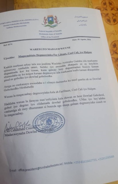 Warqadda ka soo baxday madaxweynaha Hirshabeelle ayaa lagu sheegay in degmooyinkaas ay buuxiyeen sharuudaha degmonimo ee degmo kasta laga doonayo.