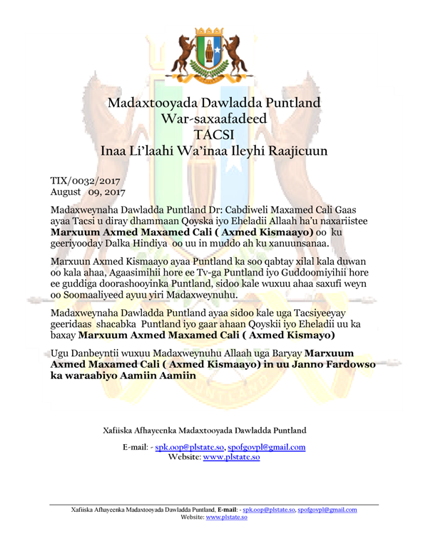 Posted on August 9, 2017August 9, 2017 by dalsan Madaxweynaha Puntland oo ka Tacsiyeeyey Geerida Marxuum, Axmed Maxamed Cali ( Axmed Kismaayo)
