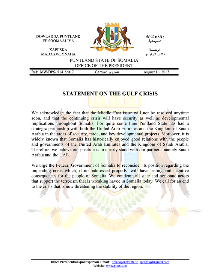 Posted on August 16, 2017August 16, 2017 by dalsan PRESS STATEMENT:- Puntland Statement On The Gulf Crisis.