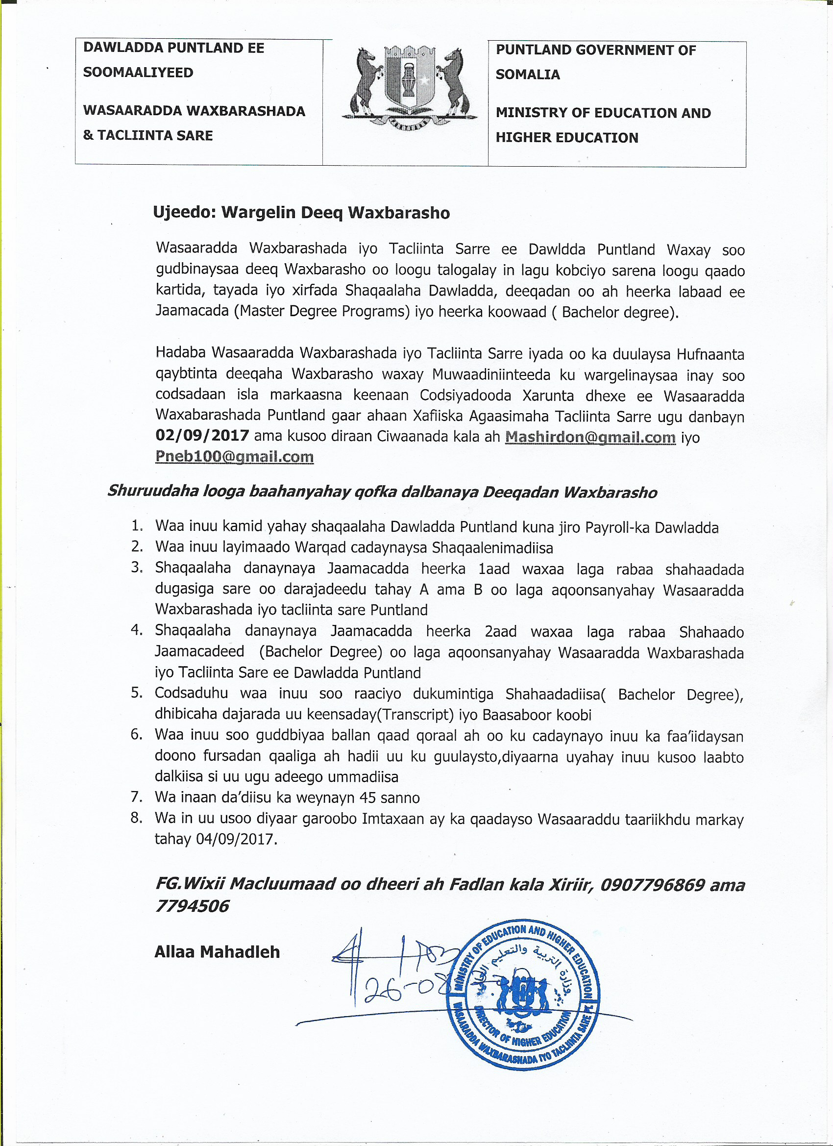 Qoraalkan ayaa lagu sheegay in Wasaaradda Waxbarashada iyo Tacliinta sarre ee Puntland uga duulayso codsiyadda deeqdaan qaabka hufnaanta qeybinta deeqaha Waxbarasho, waxaana lagu wargaliyay ugu dambeyn 02 bisha Setemper 2017 inay kusoo gudbiyaan araajidooda muwaadiniinta danaynaya fursadan.