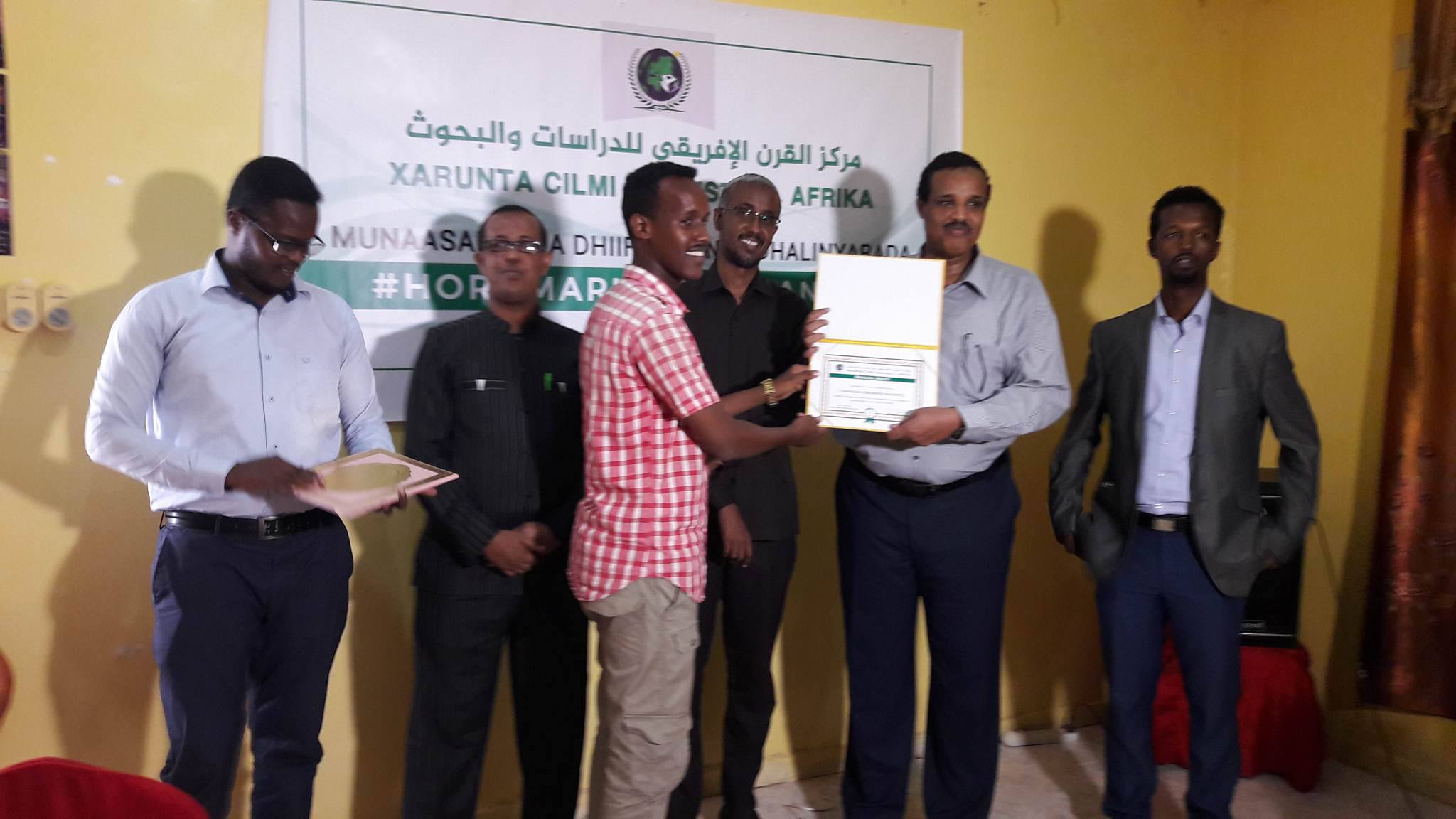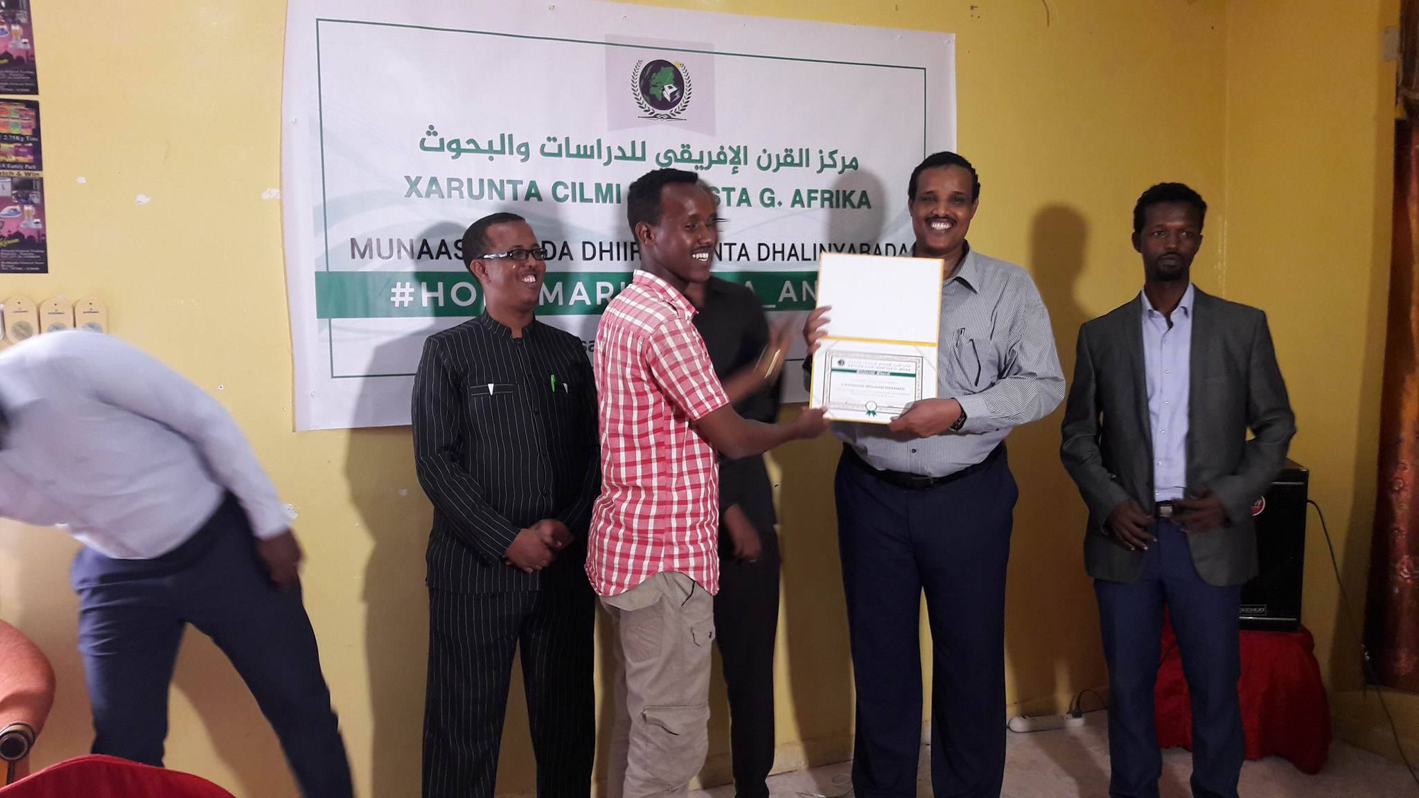 Ugu dambayntii Wasiir Ashkir iyo Madaxda Xarunta Cilmi-baarista geeska Africa waxay shahaado sharaf guddoonsiiyeen dhalintii wiilal iyo gabdhaba lahaa ee ka qayb qaatay Calaamadinta waddooyinka magaalada Bosaso.