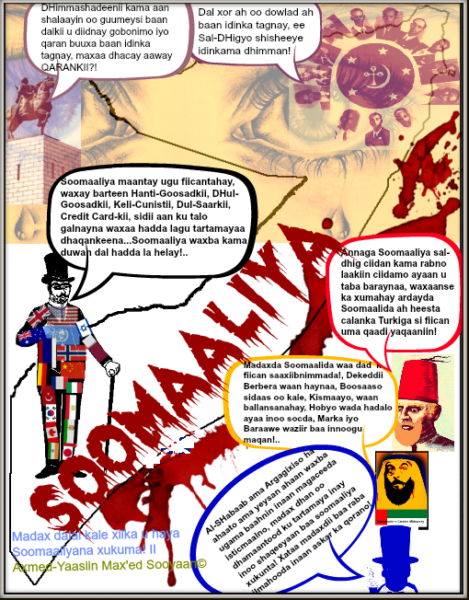 Heerarka la marayo, waxaad moodaa Soomaaliya inay dib ugu noqotay qarnigii 19aad dabayaaqadiisii markii intii Afrika la soo qaybsaday oo dalalkii qaaradda uu guumeystuhu qabsaday hadana madaxda dalka xukumaysa isaga u soo magcaabyiyay. Tan iyo maalintii colaada ay bilaabatay waxaa maalin kasta inoo soo baxay niman shaati siyaasadeed qaba oo waxay doonaan dalka ka samayniya, wax kastana dhaafsaday danahoodagaarka ah, waxaa ina soo maray baddii baa sun lagu duugay, waxaa ina soo maray maraakiib jariif ah baa baddii laga kireeyay, waxaa ina soo maray baddii baa la gatay, waxaan maanta maraynaa in dekedaheenii, gigooyinkeenii, iyo dhammaan ilihii adeegyada guud dhamaan annagoo taagtaagn niman xil sheeganaya gadgadaan, oo xilka yaa u dhiibay? Midka ay dalkeena ka iibinayaan baa u dhiibay….yaa sharciga ay ku iibinayaan soo dejiyay?! Midka ay ay ka iibinayaan baa soo sharciga ay ku iibinayaan u sameeyay!….annaga maxaan xaq dhowraynaa oo laynagu hdacay, maxaan xaq dhowraynaa oo dhaxalkii awoowayaasheen laynagu dhaafiyay…SHarci iyo xeer aanan annaga samaysan, oo aan waxba laynaga weydiin, yaa ina dhacayamadax aanan annaga keensan oo aan annaga waxba inoo ogeyn oo dalal shisheeye xilka u haya!…DHalin-Yarooy Adigoo Xor Ahna Noolow, Adigoo Xor Ahna DHimo!