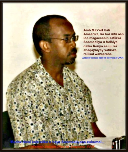 Max’ed Cali Ameerika, wuxuu kamid ahaa dhalin yaradii dibadaha ama dalalka reer galbeedka uga yimid ama uga yeereen siyaasiyiinta fadhiyay shirkii Mbagathi, wuxuuna markii u horeysay shaqadiisa ka bilaabay xafiiskii Ra’iisal wasaarihii hore Cali Max’ed Geeddi. Waxaa ka horeeyay oo isagana Geeddi xoogaa la shaqeeyay, markii horena loo malayniyay inuu xilkaas safiirnimmada ah qabanayo nin kale oo isagana kamid ahaa dadkii qurbaha ka yimid oo lagu magacaabayay Cabdiraxmaan Maleeshiyo. Waxaa iyadana sidaa soo kale Wasiir kasta, ama Xildhibaan kasta maalmahaas ka ag dhowaa oo boorsada ka daba waday dhallin-yaro ay intooda badan uga yeerteen dalalka reer galbeed ah, iyadoo ujeeddaduna ahayd in lagu gaaro kalsoonida dalalka dhalintaas laga keenay ama ay ka yimaadeen si loogu gaaro hadaf siyaasadeed ama haddaan si kale u iraahdo xil ama mansab siyaasadeed…qaabkaas uu Max’ed Cali Ameerika ku yimid wuxuu ahaa qaab ama nidaam ay waxa Beesha Caalamka loogu yeero ku shaqaalaysatay dad badan uguna soo darsatay hoggaanka siyaasadda dalka; qaar noqday xil-dhibaano, kuwa noqday Wasiiro, agaasimayaal, waxa ugu badan ee kaalin ahaan ay u haleen waxay ahayd safiirnimo, iyo xiriirrad arrimaha dibadda….Ugu dambayntiina waxa Beesha Caalamka loogu yeero waxay ku guuleysatay inay hoggaankii siyaasadda dalka ka dhigto mid dunida oo dhan ay wada leedahay….Is-casilaaddii Cabdullaahi Yuusuf ka dib Af-hayeenkkii Baarlamanka Adan Madoobe wuxuu ku dhawaaqay in doorashada Madaxweynaha dhaqso loo qabanayo ayna ka dhacayso Baydhabo laakiin ma dhicin sidaas!….