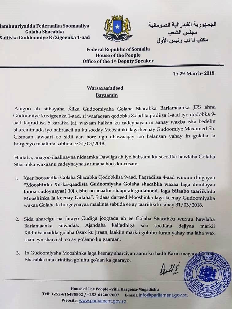 Muqdisho (PP) ─ Guddoomiye ku-xigeenka koowaad ee Golaha Shacabka Somalia, C/weli Ibraahim Muudey ayaa soo saarey qoraal uu mar kale ku caddeeyay in Sabtida berri ah Xildhibaanada Aqalka Hoose ee golaha shacabka ay u fariisan doonaan Mooshinka laga keenay Maxamed Sheekh Cismaan Jawaari.
