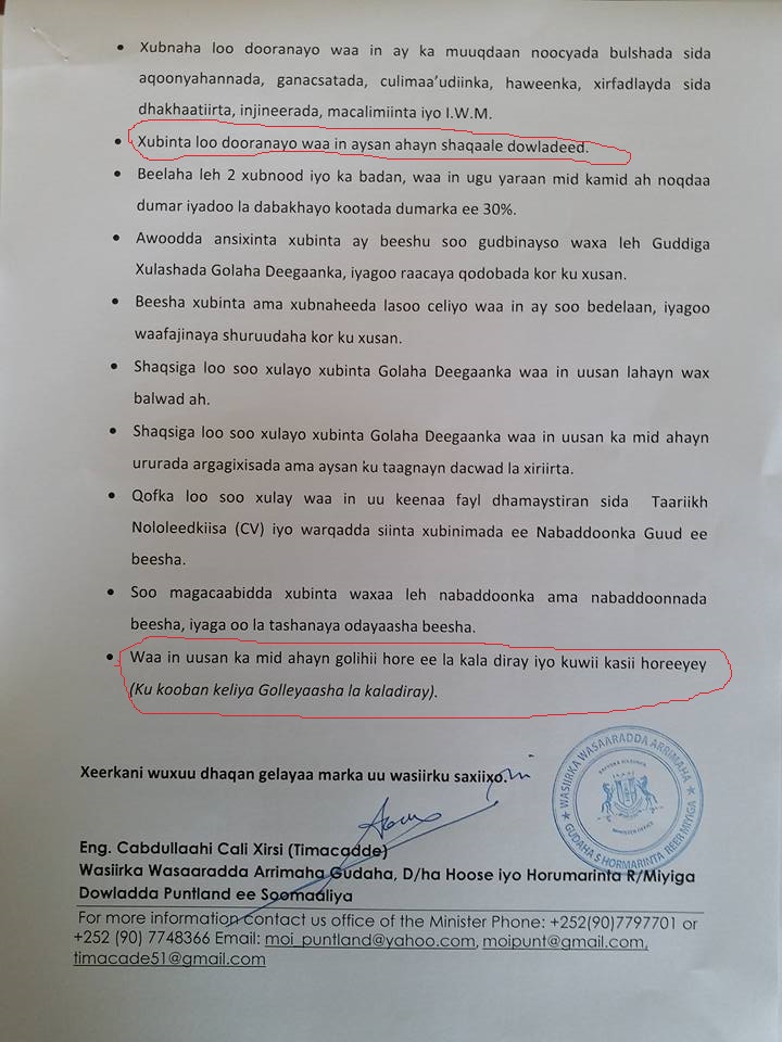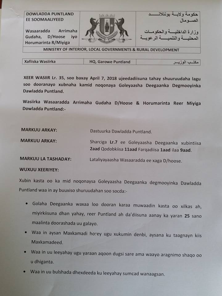 Dhinaca kale wasaaradda ayaa shuruudaha ku soo dartay in aan qof ka tirsan shaqaalaha dowladda Puntland loo soo xuli karin, xubnaha cusub ee Golaha Degaanka Garoowe.