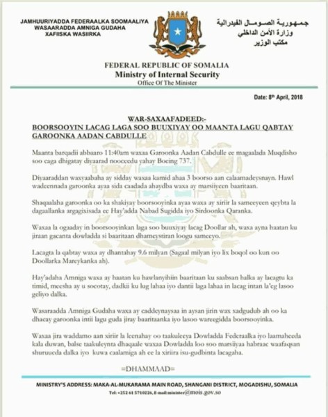 War-saxaafadeed ka soo baxay Wasaarada Amniga Gudaha Xukuumadda Soomaaliya ayaa lagu sheegay in maanta barqadii abaaro 11:40am ay Garoonka Aadan Cade soo caga dhigatay diyaarad nooceedu yahay Boeing 737 oo siday Boorsooyin laga soo buuxiyay lacago doolar ah.