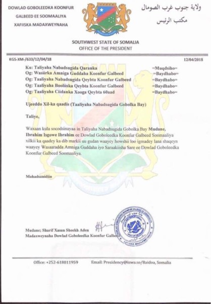Digreetada xilka looga qaaday Taliha Nabad sugidda Gobolka Baay ayaa la ogeysiiyay Taliyaha Nabad sugidda Qaranka, Wasiirka Amniga Gudaha Koonfur Galbeed, Taliyaha Nabad sugidda qeybta Koonfur Galbeed, Taliyaha Booliska qeybta Koonfur Galbeed iyo Taliyaha Ciidanka Xoogga dalka qeybta 60-aad.