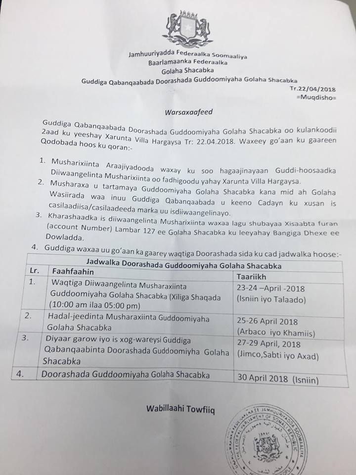Guddiga qaban qaabada doorashada Guddoomiyaha Golaha Shacabka Baarlamaanka Federaalka Soomaaliya oo maanta kullankooda 2-aad ku yeeshay xarunta Villa Hargeysa ayaa waxay soo saareen Jadwalka doorashada Guddoomiyaha Golaha Shacabka Baarlamaanka Federaalka Soomaaliya.