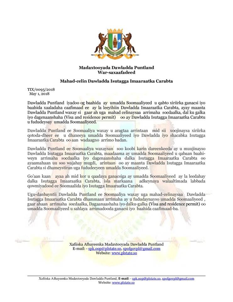 Dowladda Puntland ayaa ugu dambeyntii si weyn ugu mahad-celisay waddanka Imaaraadka Carabta oo ay ku ammaantay tallaabadan cusub ee uu qaaday.