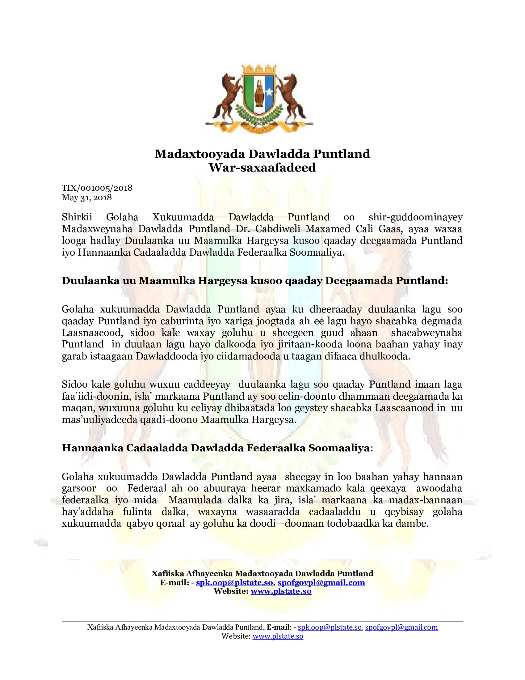 War-murtiyeed ka soo baxay shirkii Golaha xukuumadda Puntland ee Khamiista maanta ah, ayaa markale lagu sheegay in Somaliland cabburin iyo xarig joogto ah ku hayso shacabka magaalada Laascaanood,islamarkaana ay qaadayso mas’uuliyadda dhibaatada loo geystay bulshada reer Laascaanood.