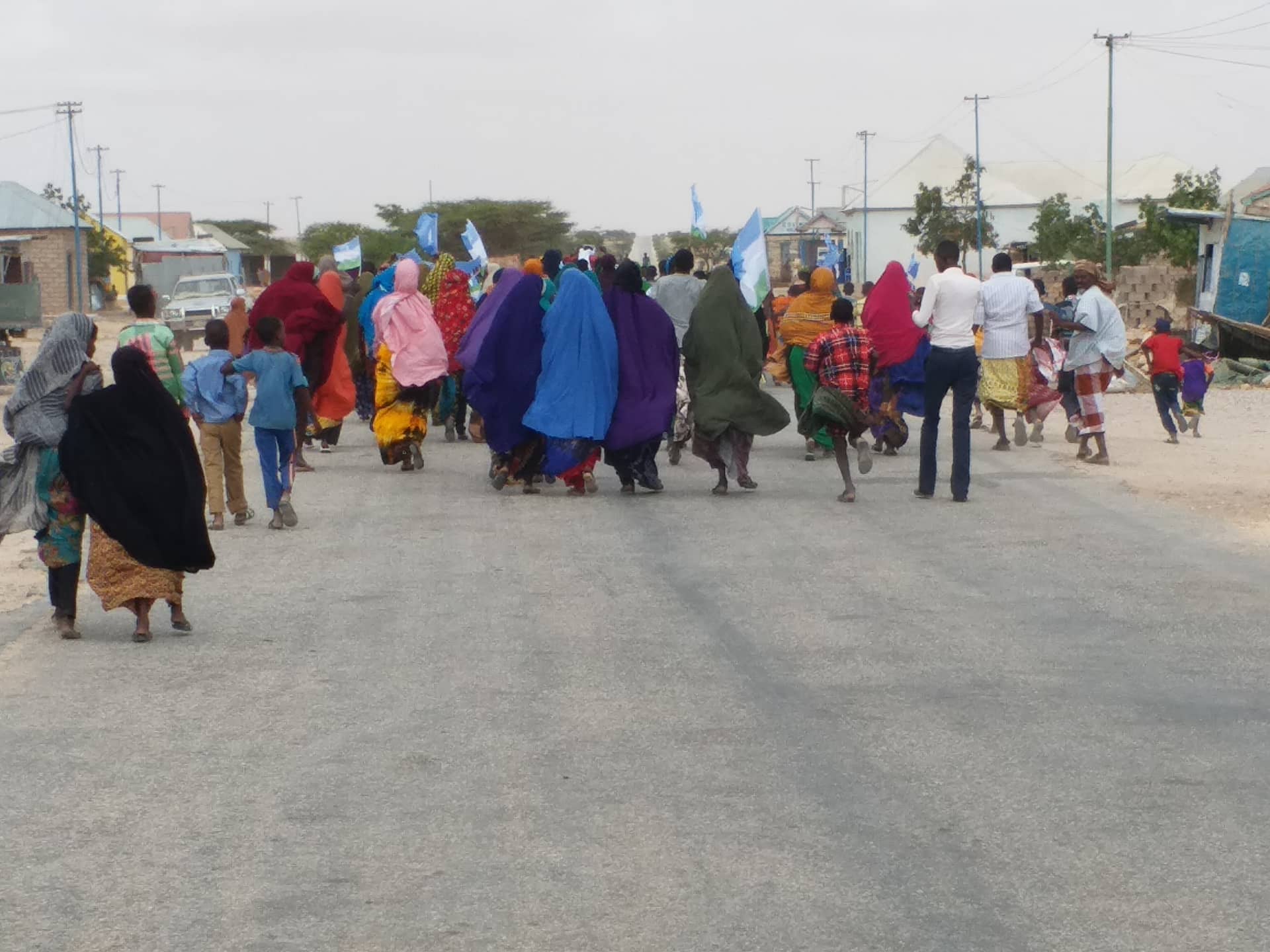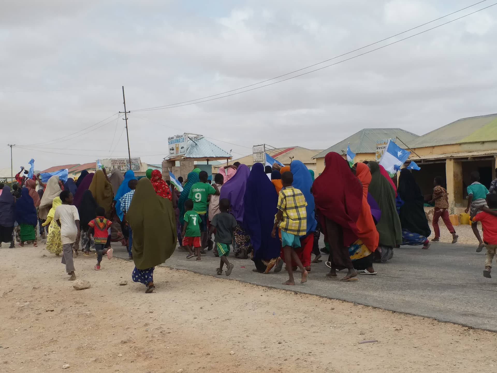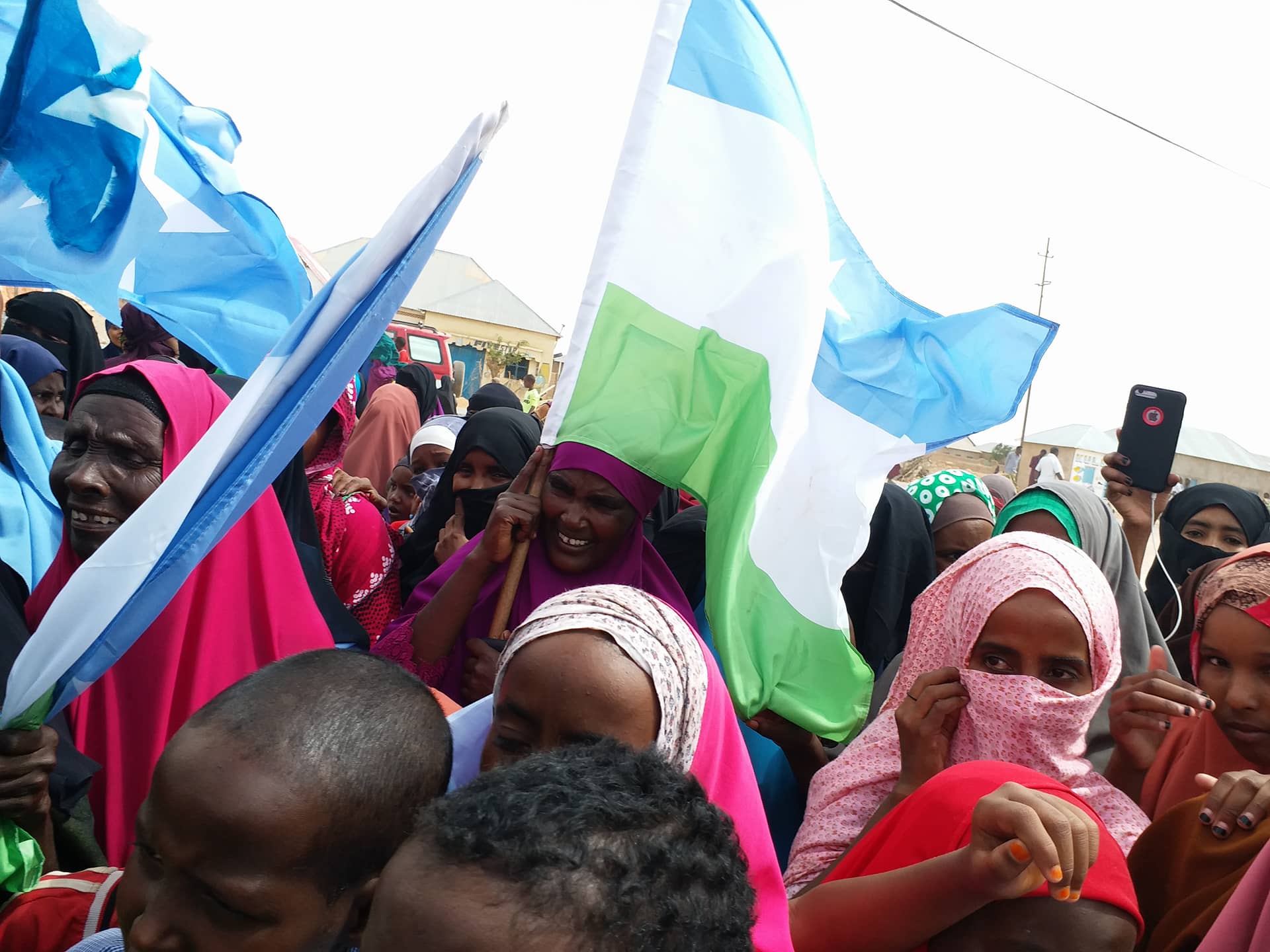 Shacabka banaanbaxa samaynayay ayaa sitey calanka Soomaaliya iyo kan maamul Goboleedka Puntland, waxayna ku qeylinayeen ereyo ay ka mi ahaayeen “ Ciidanka Puntland guulaysta” Jabiya Soomaali diidka iyo Ereyo kale.