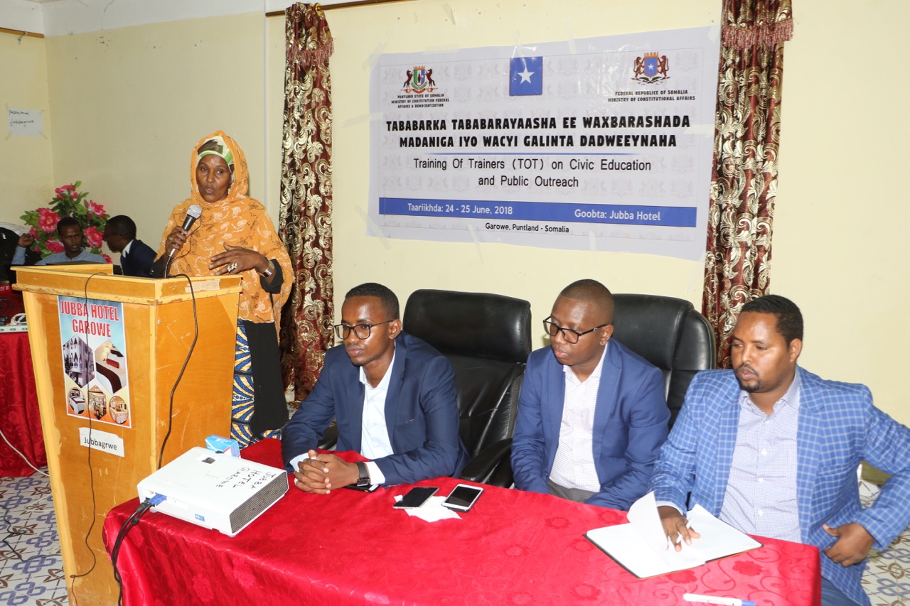 Tababarkan ayaa mid noociisa waxa Wasaaradda horay ugu soo qabatay qaar kamid ah magaalooyinka Muqdisho iyo Baydhabo, waana mid dadka Soomaaliyeed loogu diyaarinayo sidii ay uga qaybqaadan lahaayeen Ololaha Dib-u-eegista Dastuurka, sidoo kale, Tababarkn mid la mid ah ayaa loo qaban doono shaqaalaha iyo howlwadeenadda dowladda Puntland,kaasi oo bilaaban maalinta Talaadada oo ku beegan 26 bishan June 2018ka.
