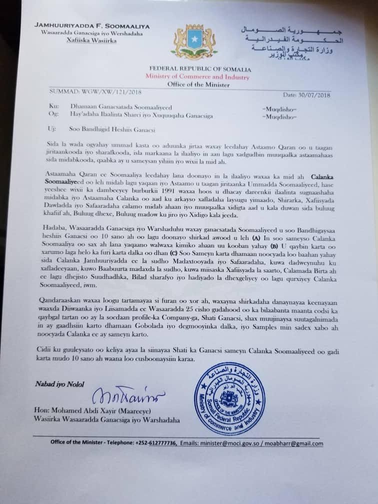 Qoraal ka soo baxay wasaaradda Ganacsiga iyo Warshadaha xukuumadda Federaalka Soomaaliya oo u ku saxiixanyahay,wasiirka wasaaraddaasi Maxamed Cabdi Xayir(Maareeye) ayaa lagu shaaciyay qandaraaskan cusub naqshadeynta calanka Soomaaliya.
