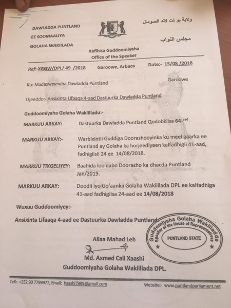 Baarlamaanka Puntland ayaa maanta soo saaray Lifaaqa 4-aad ee dastuurka Puntland, kadib markii shalay ay caddeeyeen in aysan xilligaan Puntland ka dhici karin doorasho qof iyo cod ah.