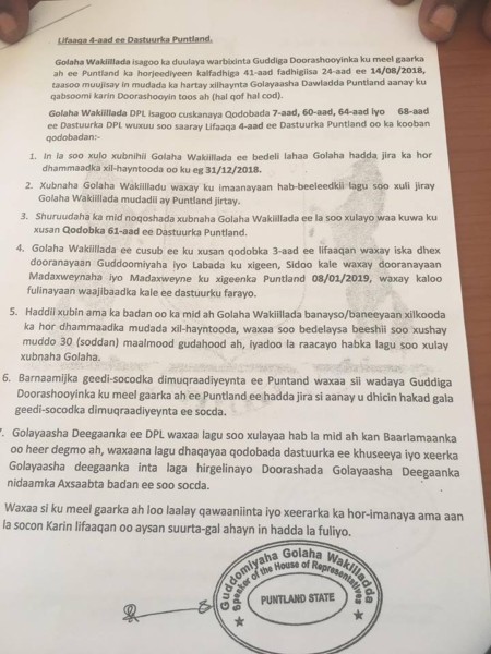 4- Golaha Wakiillada ee cusub ee ku xusan qodobka 3-aad ee lifaagan waxay iska dhex dooranayaan Guddoomiyaha iyo labada ku xigeen, sidoo kale waxay dooranayaan Madaxweynaha iyo Madaxweyne ku xigeenka Puntland 08/01/2019, waxay kaloo fulinayaan waajibaadka kale ee dastuurku farayo.