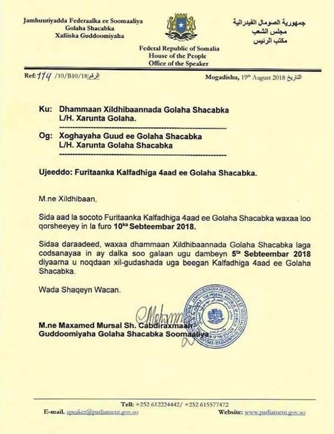 “Furitaanka kal-fadhiga afaraad ee baarlmaanka waxaa loo Qorsheeyay in la furo 10-ka September 2018-ka, sidaa awgeed waxaa xildhibaanada oo dhan laga codsanayaa inay dalka soo galaan ugu dambeyn 05-ta bisha soo socota, diyaarna u noqdaan xil-gudashadooda,” ayaa lagu yiri qoraalka uu Mursal soo saaray.