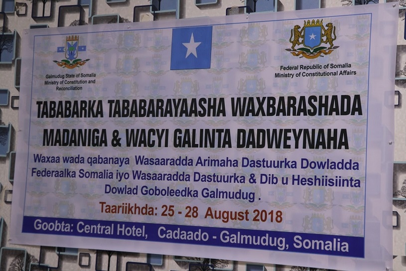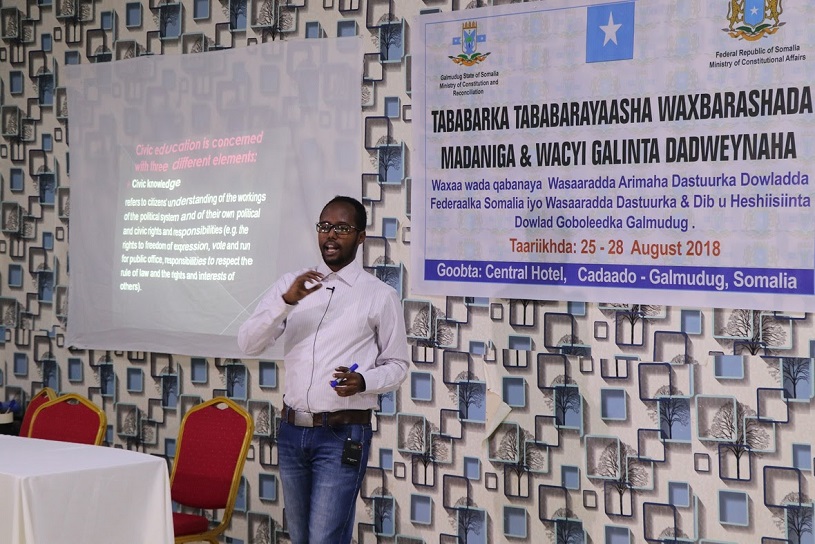 Cadaado (PP) ─ Wasaaradda Dastuuurka Xukuumadda Soomaaliya iyo Wasaaradda Dastuurka iyo Dib-u-heshiisiinta Galmudug, ayaa magaalada Cadaado ka furay maanta Tababarka tababarayaasha waxbarahda madaniga ah iyo wacyi gelinta dadwaynaha ee ariimaha dastuurka.