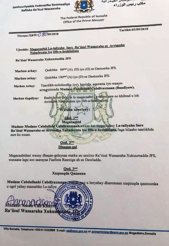 Sidoo kale, Wareegtada waxaa lagu sheegay in magacaabista Baadiyoow uu arkay taariikh nololeedka (CV), kartida, aqoonta iyo waayo-aragnimada Dr. Baadiyow, wuxuu u magacaabay la-taliyaha sare Ra’iisul Wasaaraha DF ee Arrimaha Nabadeynta iyo Dib-u-heshiisiinta.