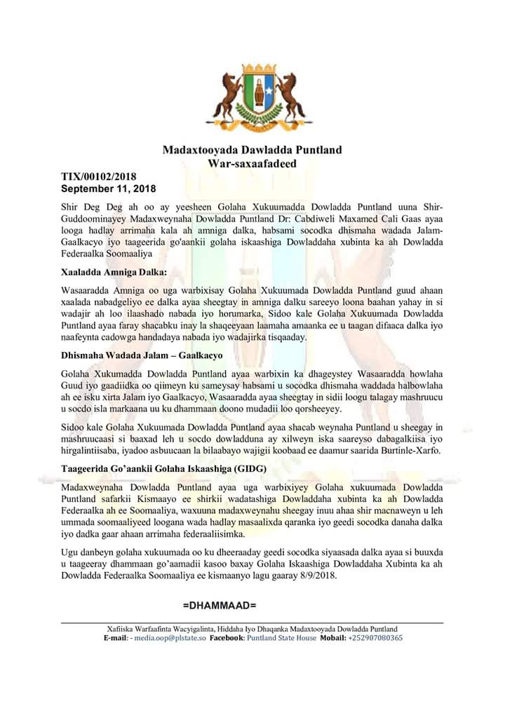 Madaxweynaha dowladda Puntland,Dr.Cabdiweli Maxamed Cali(Gaas) oo guddoomiyay shirkan deg deg ah ayaa xukuumadda faahfaahin ka siiyay qodobadii lagu go’aamiyay shirkii madasha iskaashiga dowlad goboleedyada dalka ee lagu qabtay magaalada Kismaayo.