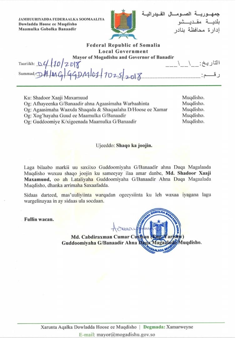 Muqdisho (PP) ─ Guddoomiyaha Gobolka Banaadir ahna Duqa Muqdisho Inj. C/raxmaan Cismaan [Yariisow] ayaa qoraalka soo baxay xafiiskiisa uga joojiyay xilka la-taliyihiisa arrimaha Saxaafadda, Shadoor Xaaji Maxamuud.