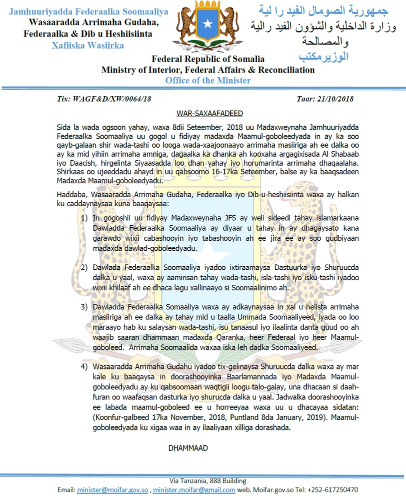 AKHRISO: Qoraalka kasoo baxay Wasaaradda Arrimaha Gudaha DF: