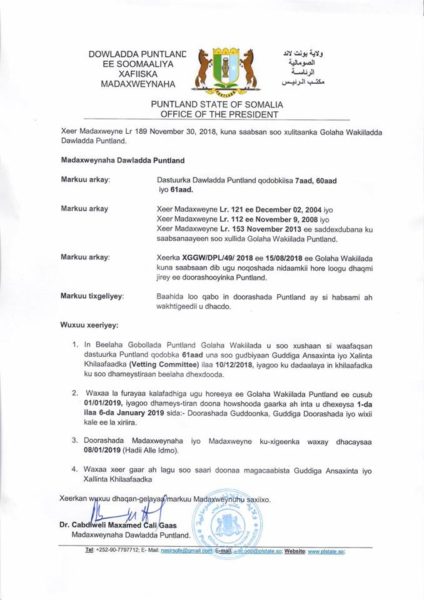 Madaxweyne Gaas ayaa qoraalka ku sheegay in beelaha Puntland ay Baarlamaanka cusub u soo gubiyaan Guddiga ansixinta iyo xalinta khilaafaadka ilaa 10/12/ 2018, iyagoo ku dadaalaya in ay khilaafka ku soo dhameystaan dhexdooda.