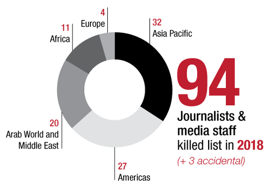 Warbixin lagu daabacday webseedka ay leedahay hay’ada calaami ah ee u dhaq-dhaaqda xuquuqda iyo xoriyada saxafiyiinta(IFJ), ayaa waxa ay soo bandhigtay tirada suxuyiinta wax ku noqday rabshadihii ka dhacay dunida dacaladeed iyada oo xustay in 2018-dii uu hoos u dhac ku yimid dilalkii loo geysan jiray saxafiyiinta ka halgala warabaahinta qeybaheeda kala gedesan. Hadaba, sida ay daraasada xustay, waxaa lagu qiyaasay dadka suxufiyiinta ah dhibaatada ka soo gaartay rabshadahaas ilaa 94 suxufi. Waxay hadalkeeda kusoo afmeertay hay’ada xiriirka Caalamiga ah ee Saxafiyiinta (IFJ) dhimashadaas cusub ayaa kor u kacday boqolkiiba 82 marka loo barbar dhiga dilalkii dhicijiray sanadahii la soo dhaafay. Waxaana loo arkaa isbedel hoos u dhac ah laga bilaabo saddexdii sano ee la soo dhaafay.