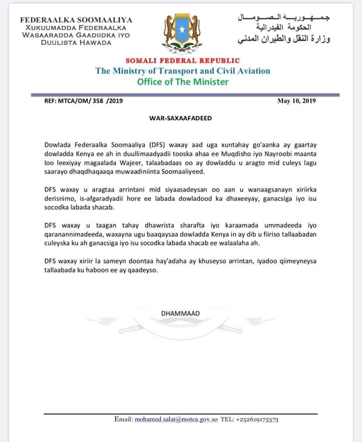 Wasaaradda Gaadiidka iyo Duulista Hawada Soomaaliya ayaawar ka soo saartay go’aankii ay dowladda Kenya ku joojisay duulimaadyadii tooska ahaa ee Muqdisho iyo Nairobi.