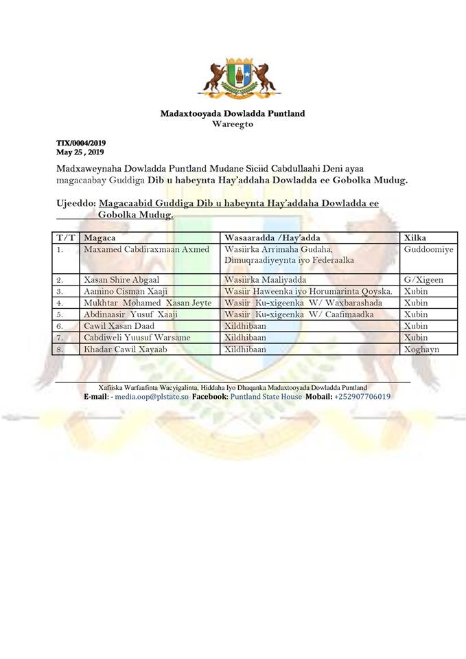 Dikreeto ka soo baxday xafiiska madaxweynaha ayaa lagu magacaabay guddiga dib u-habaynta hay’adaha dowladda ee gobolka Mudug oo ka kooban 8 xubnood kana ka kala tirsan golayaasha xukuumadda iyo Baarlamanka Puntland.