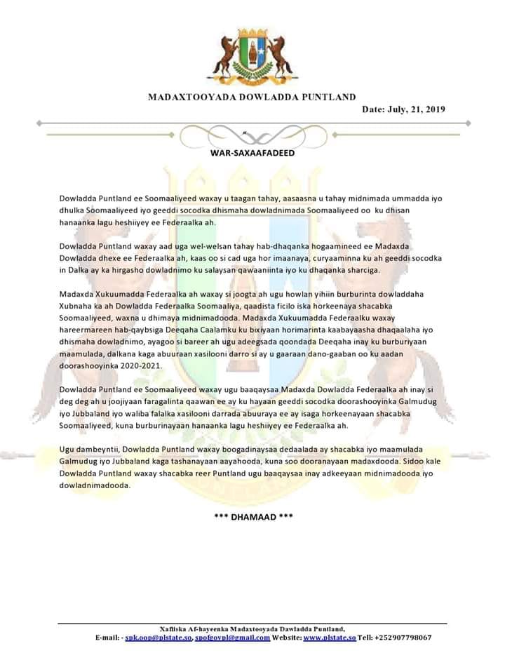 War-saxaafadeed ka soo baxay xafiiska madaxweyne Deni, ayaa lagu sheegay in dowladda Puntland ay aad uga walwalsantahay hab-dhaqanka hoggaamineed ee madaxda dowladda Federaalka Soomaaliya, kaasi oo sida ay Puntland sheegtay ka hor-imaanaya in dalku yeesho dowladnimo ku dhisan hirgelinta sharciga.