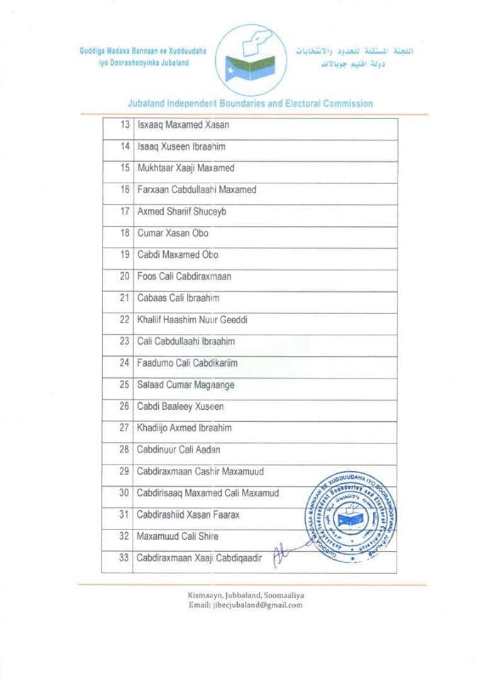 Guddiga madaxa-bannaan ee doorashooyinka iyo Xuduudaha dowlad goboleedka Jubaland ayaa caawa shaaciyay liiska xildhibaannada cusub ee Baarlamanka Jubaland.