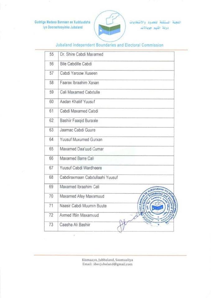 Liiska xildhibaannada cusub oo ka kooban 73 Xildhibaan ayaa sida guddigu sheegay muddo 20 cisho ah ay soo xulayeen Odayaasha dhaqanka Jubbaland islamarkaana ugu dambayn u soo gudbiyeen Guddiga madaxa-bannaan ee doorashooyinka si waafaqsan hannaanka doorashooyinka Jubbaland.