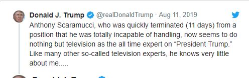 Dhanka kalena, madaxweyne Trump ayaa sheegay in Anthony Scaramucci shaqsi dhowaan shaqada isaga baxay warbaahintuna ku buunbuunisay arrimihiisa falan qaynta haseyeeshee uusan wax xog badan ah ka ahayn shaqsiyada Donald Trump.