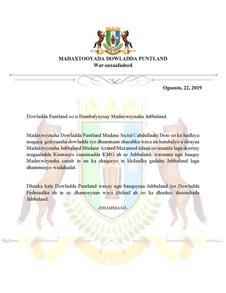 Dowladda Puntland oo soo dhoweysey doorashadii Jubbaland.
