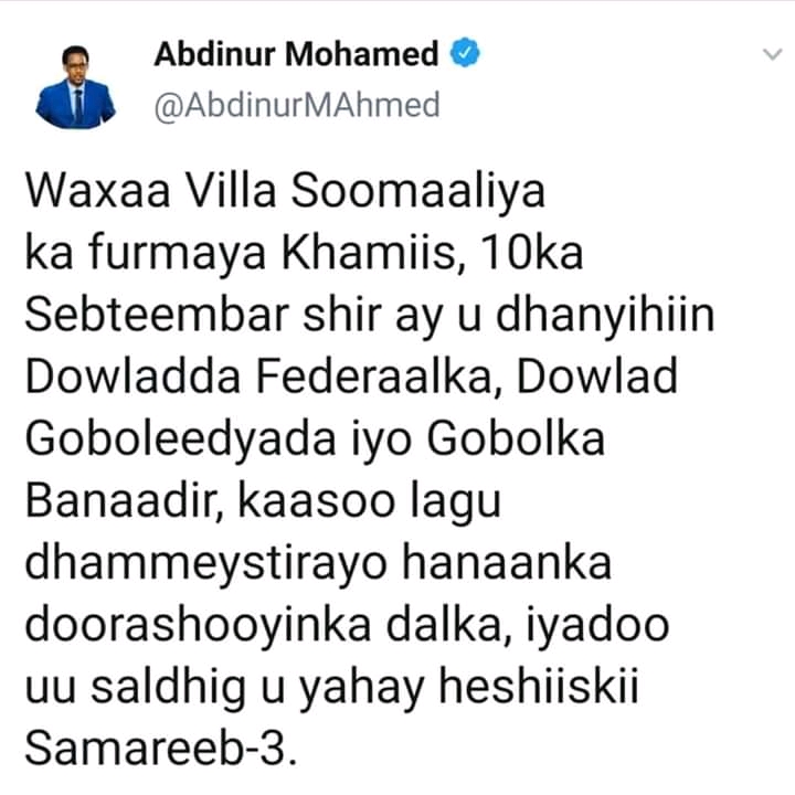 Agaasimaha warfaafinta madaxtooyada Soomaaliya Cabdinuur Maxamed Axmed ayaa qoraal uu ku daabacay bartiisa Twitter-ka ku sheegay in 10-ka bishan September uu shir uga furmayo Muqdisho dowladda federaalka, dowlad goboleedyada iyo gobolka Banaadir.