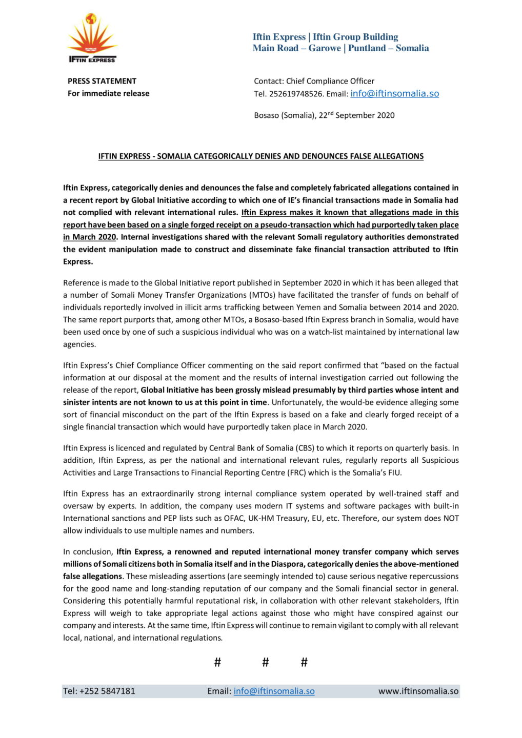 Iftin Express’s Chief Compliance Officer commenting on the said report confirmed that “based on the factual information at our disposal at the moment and the results of internal investigation carried out following the release of the report, Global Initiative has been grossly mislead presumably by third parties whose intent and sinister intents are not known to us at this point in time. Unfortunately, the would-be evidence alleging some sort of financial misconduct on the part of the Iftin Express is based on a fake and clearly forged receipt of a single financial transaction which would have purportedly taken place in March 2020.