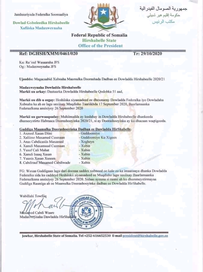 Madaxweynaha Hirshabeelle Maxamed Cabdi Waare ayaa magacaabay 8-da xubnood ee Guddiga heer dowlad goboleed ee Doorashada Dadban