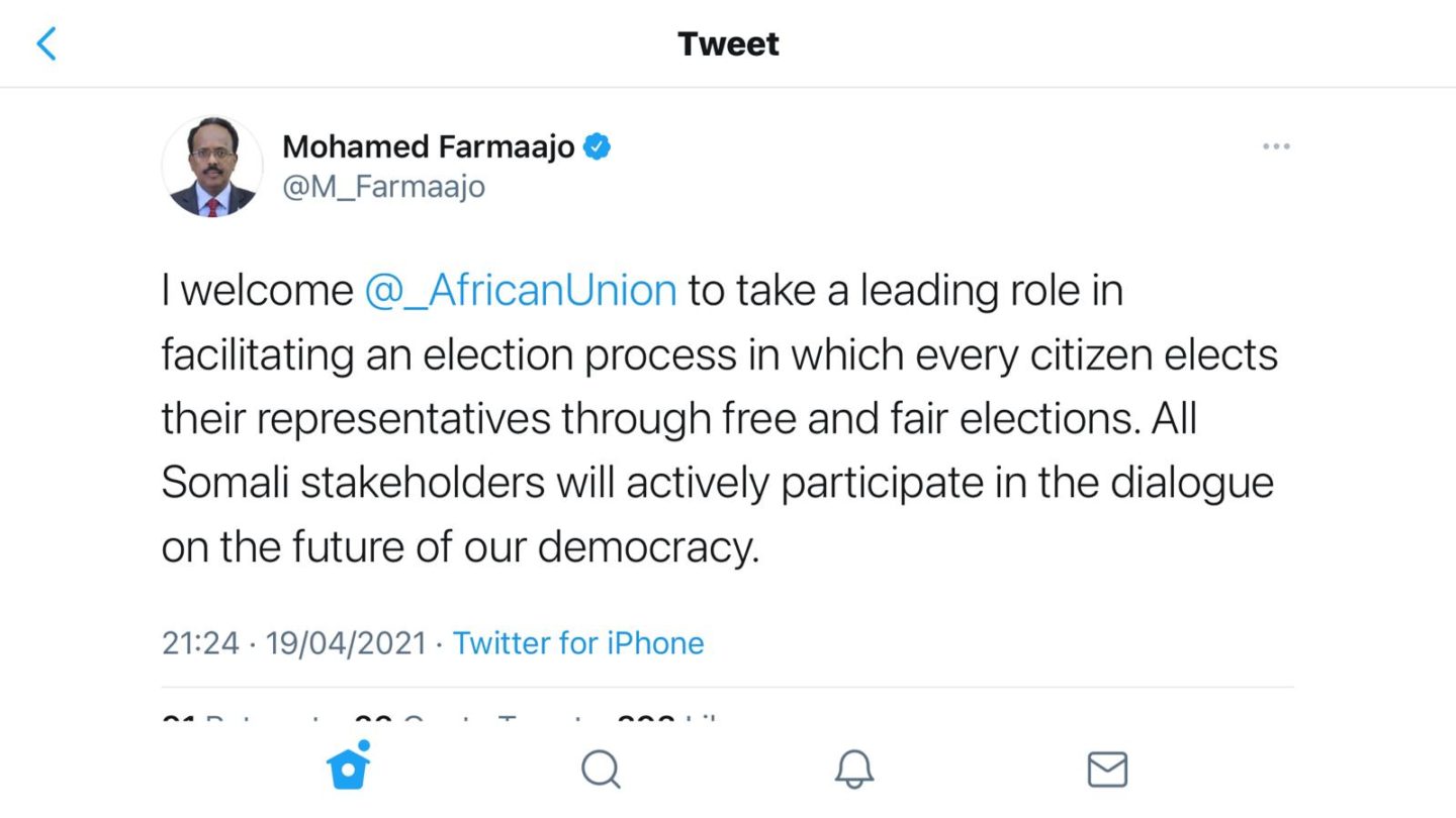 “I welcome @ AfricanUnion to take a leading role in facilitating an election process in which every citizen elects their representatives through free and fair elections. All Somali stakeholders will actively participate in the dialogue on the future of our democracy” tweeted President Mohamed.