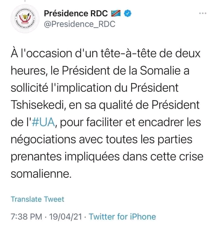 Mogadishu (PP News Desk) — The President of the Federal Republic of Somalia Mohamed Abdullahi Mohamed, who is visiting Democratic Republic of the Congo, has expressed support for an African Union mediator role to break the electoral impasse in Somalia.