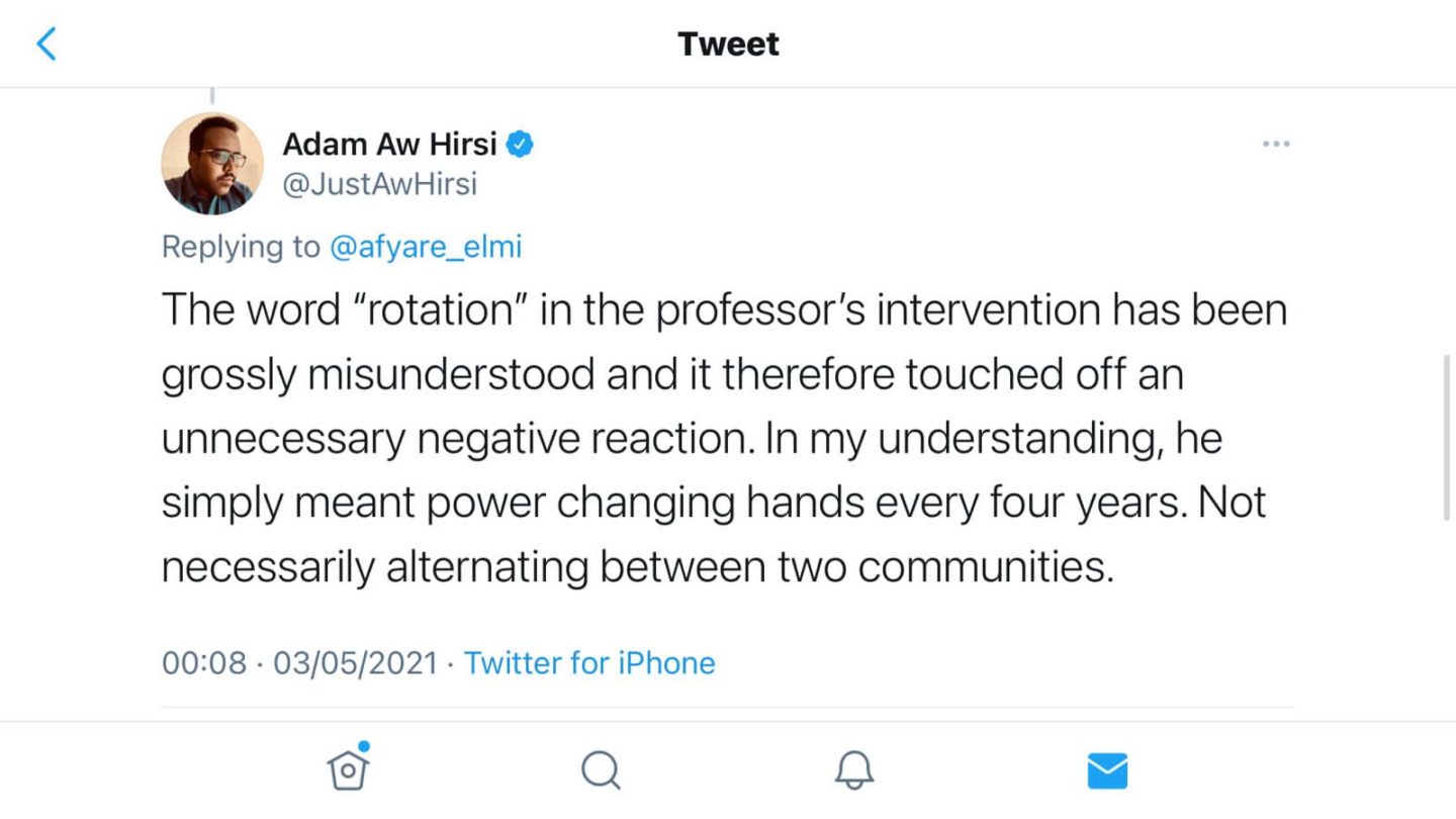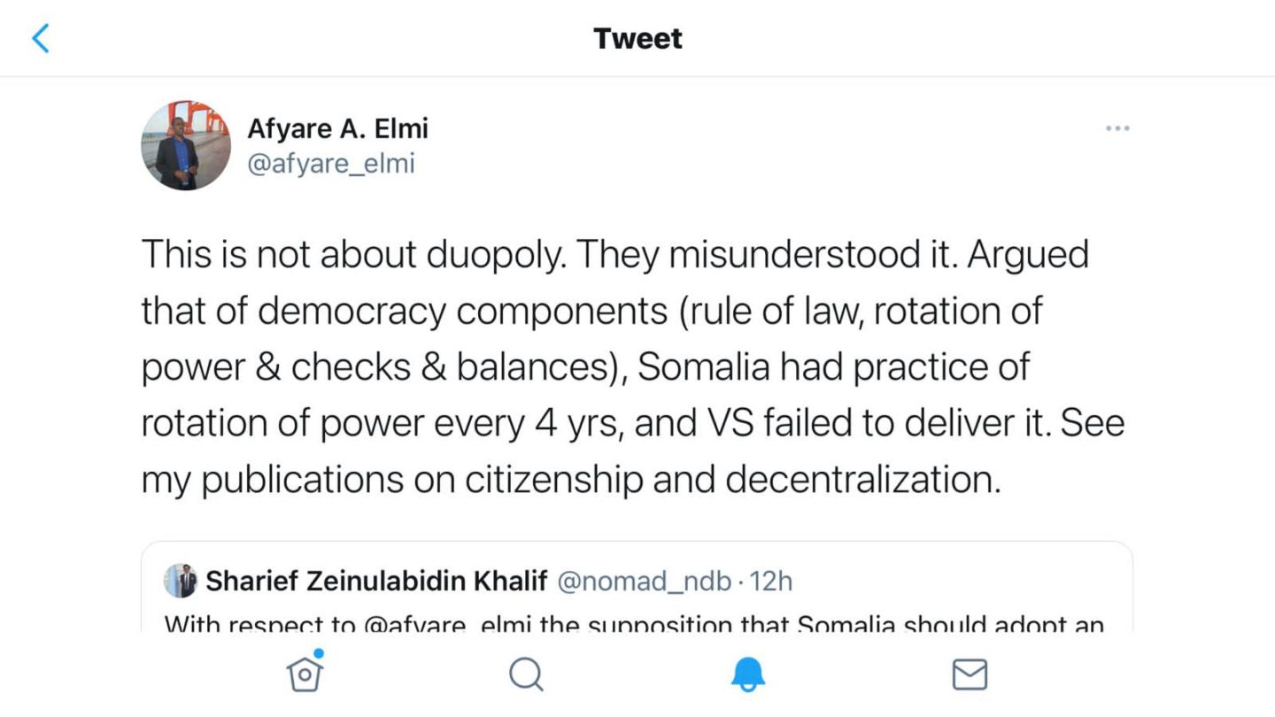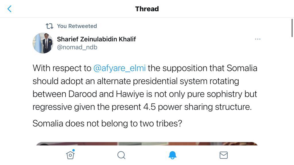 “With respect to @afyare_elmi the supposition that Somalia should adopt an alternate presidential system rotating between Darood and Hawiye is not only pure sophistry but regressive given the present 4.5 power sharing structure. Somalia does not belong to two tribes?” tweeted Sharief Zeinulabidin Khalif. In a tweet, Afyare begged to differ: