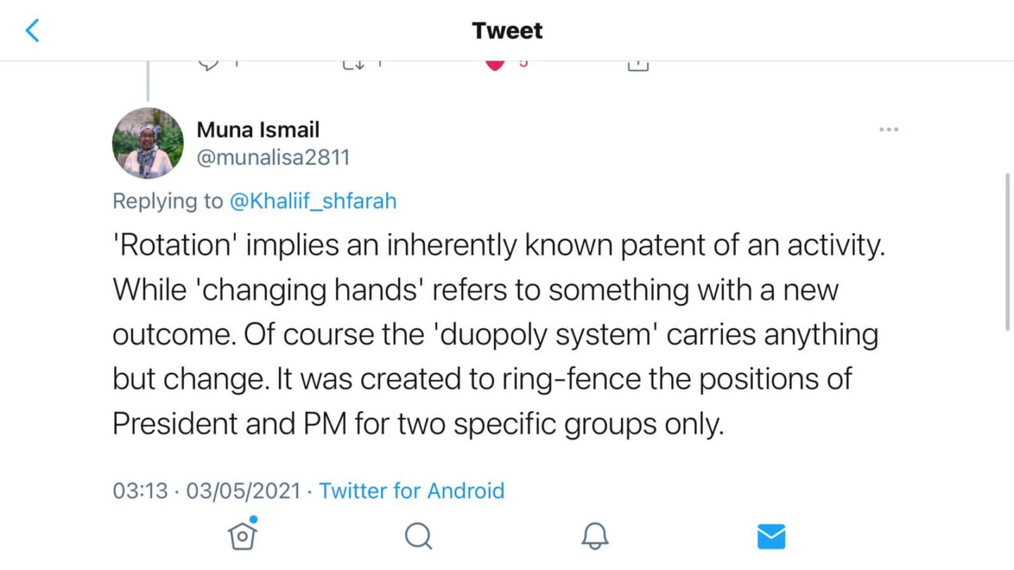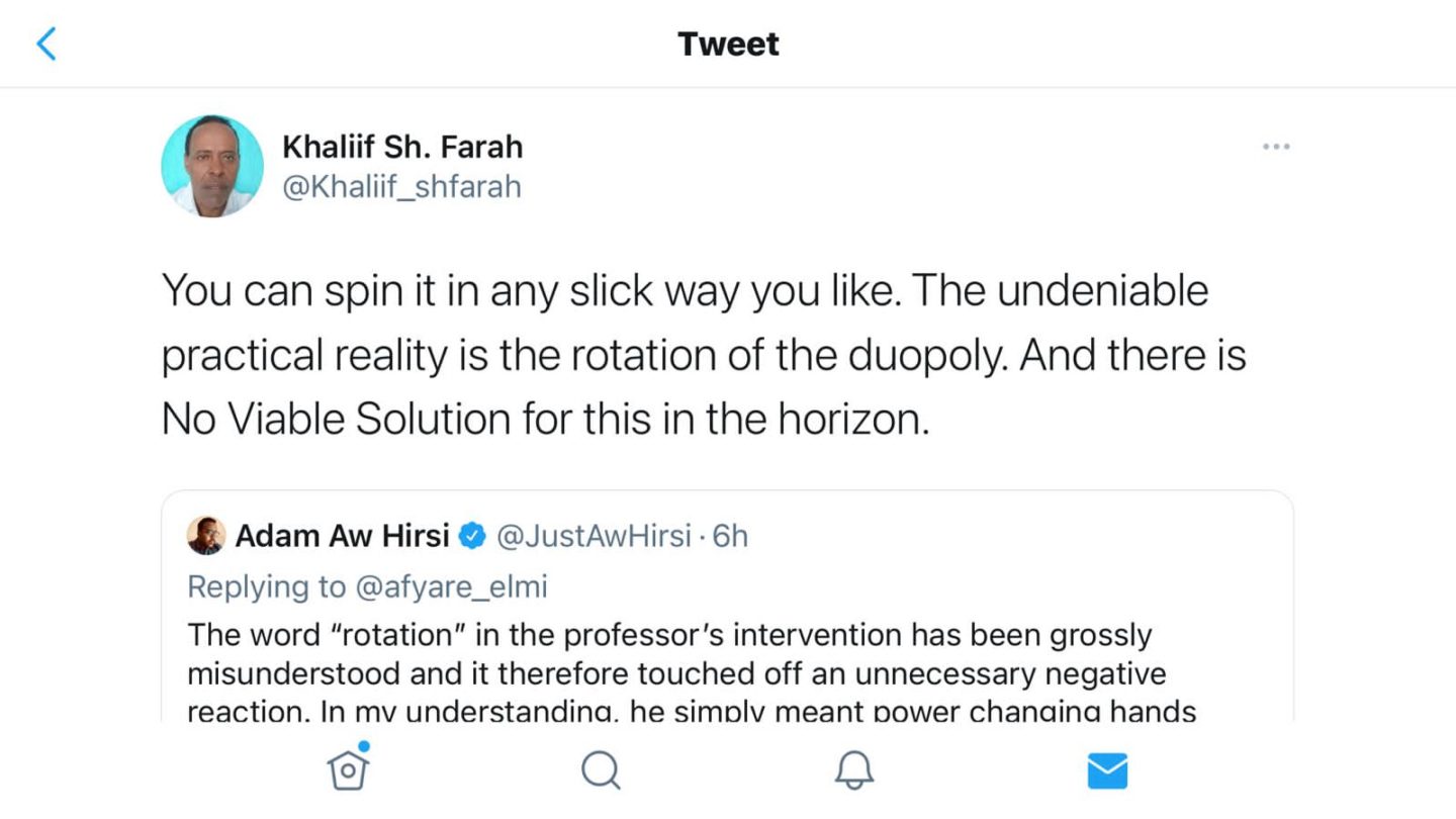 It is this difinition of the verb that Muna Ismail has in mind when, in reply to Adam Aw Hirsi, she tweeted: “Rotation’ implies an inherently known pattern of an activity. While ‘changing hands’ refers to something with a new outcome. Of course the ‘duopoly system’ carries anything but change. It was created to ring-fence the positions of President and PM for two specific groups only.”