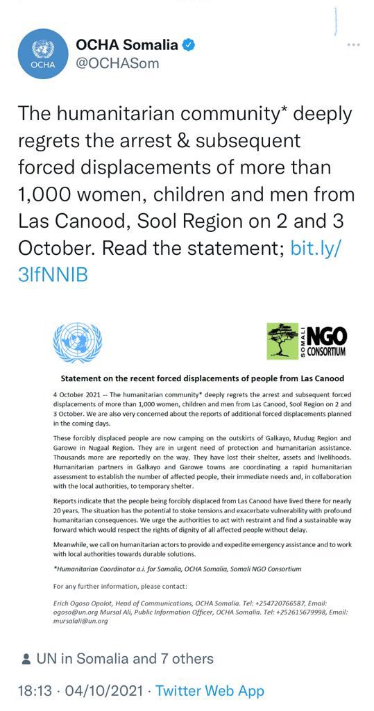 The humanitarian community deeply regrets the arrest and subsequent forced displacements of more than 1,000 women, children and men from Las Canood, Sool Region on 2 and 3 October” tweeted The United Nations Office for the Coordination of Humanitarian Affairs. “Forced displacement is a crime against humanity” added Adan.