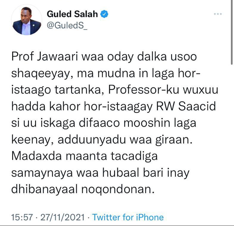 Guled owes apology to the South West State of Somalia. Jawari is an elder statesman who was elected the Speaker of the Federal Parliament twice. It is an open secret that Jawari is aligned politically with Damuljadid. Nothing is wrong with his political inclination but it is unfair to South West State elders to assume that they have a duty to elect Jawari. The evolution of our federal system is something to be proud of particularly when the political influence of the capital does not determine who becomes an MP or Senator. It is a process that the Union of Presidential Candidates should applaud in their stronghold — Mogadishu.