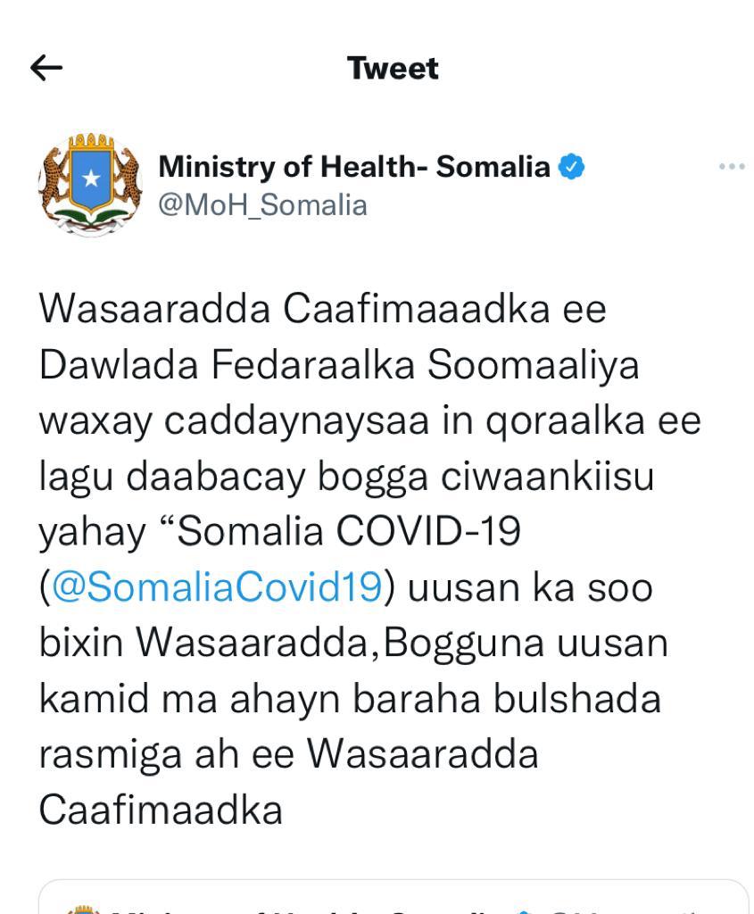 “The Ministry of Health confirms that the content associated with the Twitter page “Somalia COVID19 (@ SomaliaCovid19)”was not released by the Somalia Federal Ministry of Health, and that page is not one of the Ministry’s official social media platforms” tweeted the Ministry.