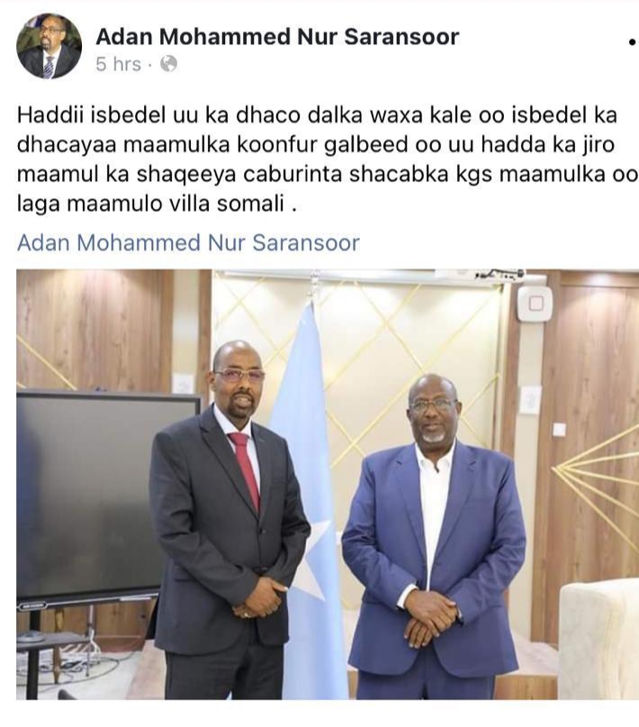 Shortly after the election Adam Madobe as the Speaker of the Somalia Parliament Adan Saransor, an MP and a critic of President Abdiaziz Laftagareen, posed for the camera with the Speaker and called for “a regime change in Southwest West State.”