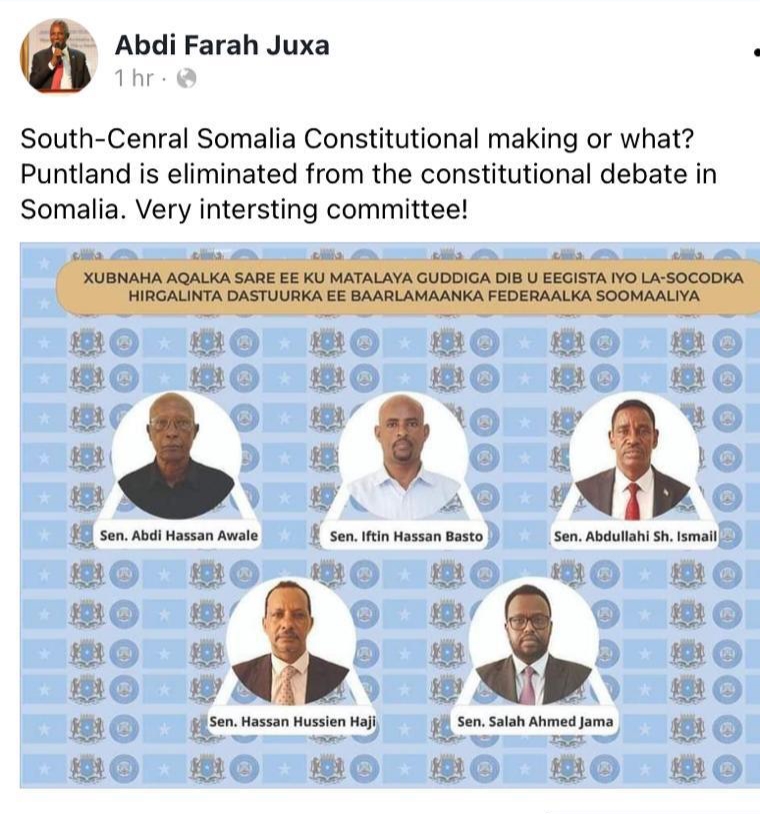 “South-Central Constitutional making or what? Puntland is eliminated from the constitutional debate in Somalia. [A] very interesting committee, “Abdi Farah Said wrote in his Facebook page.