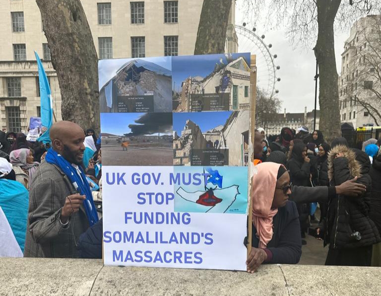 Despite its one-Somalia policy, the British government funds Somaliland security forces shelling Laascaanood under the pretext that the district is not a part of the Federal Republic of Somalia. “UK Government must stop funding Somaliland massacres” reads one placard about the indiscriminate shelling of Laascaanood by Somaliland forces waging a secession war.