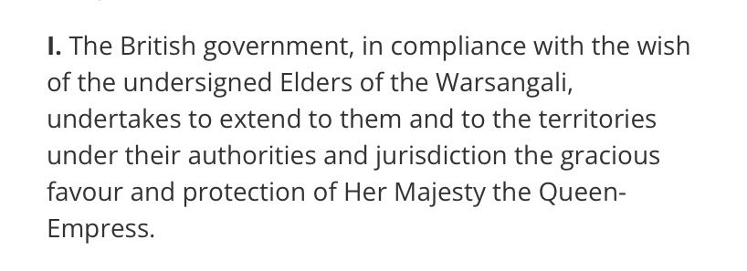 After the 1884 Berlin Conference to colonise Africa, The British Empire signed Protection Agreements with Somali Northern clans. Although the key wording in the agreements are almost the same, Warsangali secured a protection agreement based on jurisdiction. The agreement with Warsangeli elders prevented the British Empire from ceding the territory of Warsangeli to other political entities even though other Warsangeli subclans live in what was Italian Somaliland. Warsangeli could seek redress through the Common Law if such a violation had happened.